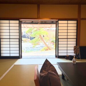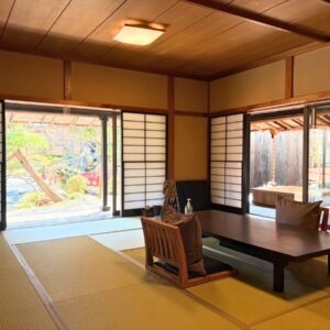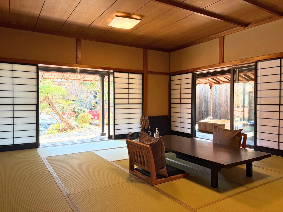 日本の美意識を感じる落ち着いた純和室に、 飼い主様用と愛犬用、それぞれに専用の露天風呂を備えた特別室「真珠」。
